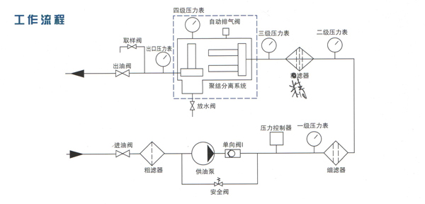 未及時(shí)沉降下來的水繼續(xù)隨油液前行,在通過分離元件時(shí),由于分離元件表層噴涂有高分子材料,對(duì)水有強(qiáng)大的排斥作用,因此可把水?dāng)r于分離元件之外,使之不能通過分離元件,水自然沉降到蓄水池內(nèi),從分離元件流出的油就是凈油,這就完成了對(duì)油凈化的全過程。蓄水池內(nèi)的水通過自動(dòng)排水裝置排出。