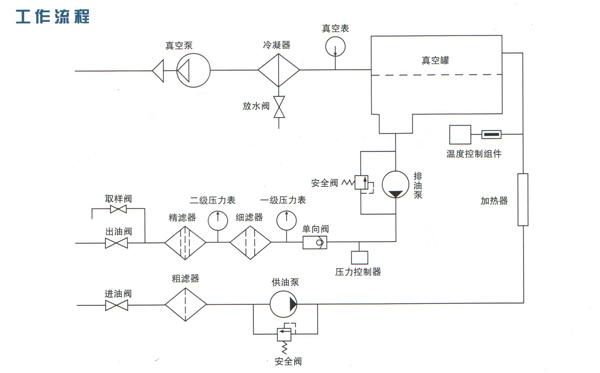 油液在供油泵的作用下首先由進(jìn)油口進(jìn)入粗濾器,通過(guò)粗濾器除去油中較大雜質(zhì)后經(jīng)過(guò)加熱器時(shí)被加熱55℃左右,加熱后的油液首先通過(guò)真空罐內(nèi)的脫氣元件噴射到真空罐內(nèi),在真空狀態(tài)下,水份會(huì)低溫沸騰而變成水蒸氣,然后被真空泵抽出,被抽出的水蒸氣在通過(guò)冷凝器時(shí)大部分被冷凝成水,小部分通過(guò)真空排氣口排出。經(jīng)過(guò)脫氣、脫水后的油液在排油泵的驅(qū)動(dòng)下經(jīng)過(guò)細(xì)濾器和精濾器除去油中殘余雜質(zhì)后由出油口排出,完成整個(gè)處理過(guò)程